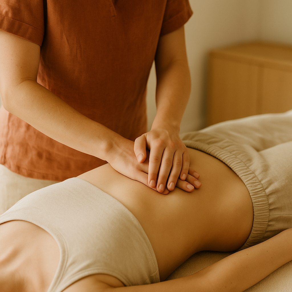 Le massage se pratique sur le ventre, avec un toucher progressif, doux mais profond.